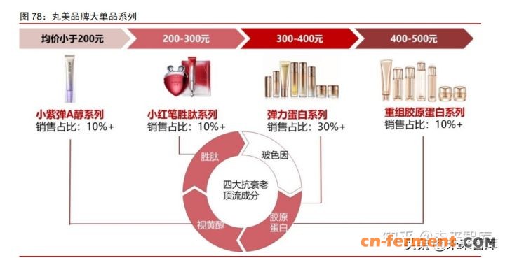 丸美股份深耕抗衰,抗衰老产品销量占比超过 70%。主品牌丸美旗下目前有 9 大抗 衰系列,分别针对不同的抗衰需求。目前抗衰老的顶流成分有四个:胜肽、视黄醇、玻 色因和胶原蛋白,公司在其中三个成分做了布局,比如在胜肽方面有小红笔胜肽家族, 在视黄醇方面有小紫弹视黄 A 醇家族,胶原蛋白赛道有重组双胶原蛋白系列。