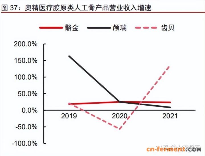 目前仅有两家公司的胶原类人工骨产品获 NMPA 批准上市,分别是华熙生物(益而 康)的瑞福,以及奥精医疗的骼金、颅瑞、齿贝。四款产品主要组成成分均为 I 型胶原蛋 白和羟基磷灰石。奥精医疗通过独有的体外仿生矿化技术模拟人体内形成骨骼的生物矿 化过程,使 I 型胶原蛋白及羟基磷灰石有序排列,形成一种与人体骨骼在组成成分和微观 结构上均相似的仿生复合材料,具备金属材料、无机非金属材料、高分子材料等其他产 品所不具备的高度仿生特点,其骼金、颅瑞、齿贝三款产品分别应用于骨科、神经外科、 口腔或整形外科领域的骨缺损修复。