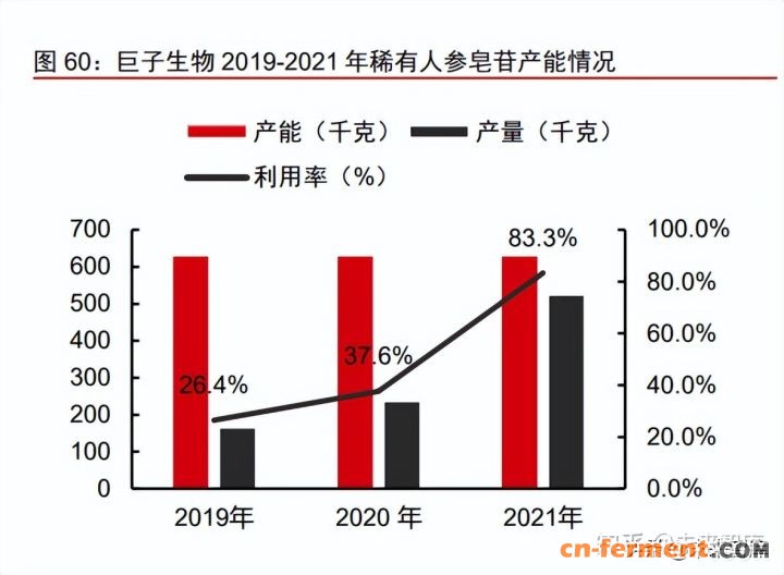 2021 年重组胶原蛋白和稀有人参皂苷产能利用率均获得大幅提升,分别为 83.5%/83.3%。公司现有重组胶原蛋白生产设施位于西安,配备两套发酵系统、预处理系 统、纯化系统、冻干系统及其配套提取设备和检测设备,2021 年重组胶原蛋白产能为 10880 千克;公司现有稀有人参皂苷的生产设施位于西安,拥有一条生产线并配有灭菌 反应釜、离心机、粉碎机及真空干燥器等,2021 年稀有人参皂苷产能为 630 千克。