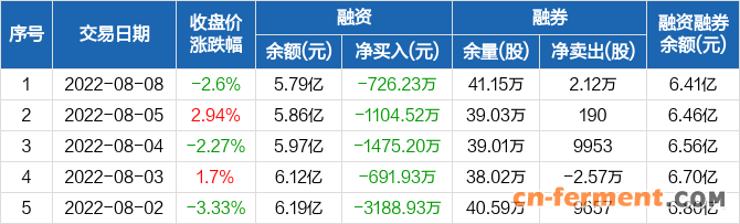 根据华熙生物融资融券信息显示,2022年8月8日融资净偿还726.23万元;融资余额5.79亿元,较前一日下降1.24%。