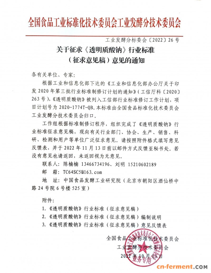 全国食品工业标准化技术委员会工业发酵分技术委员会关于征求《透明质酸钠》行业标准(征求意见稿)意见的通知