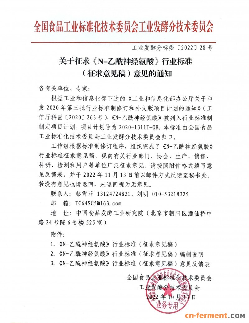 全国食品工业标准化技术委员会工业发酵分技术委员会关于征求《N-乙酰神经氨酸》行业标准(征求意见稿)意见的通知