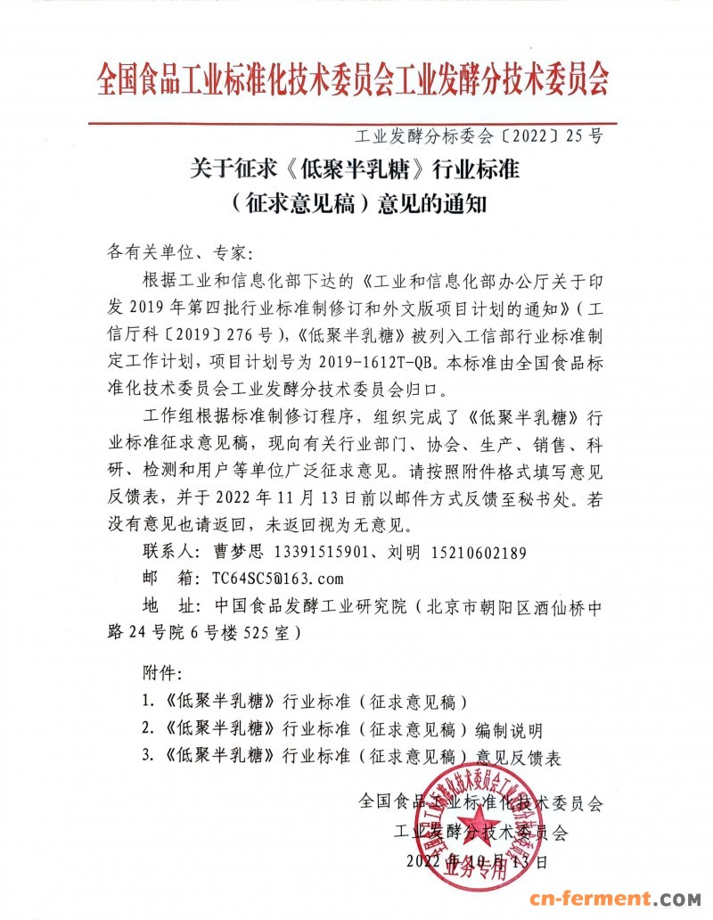附件:通知、《低聚半乳糖》行业标准(征求意见稿)、编制说明及意见反馈表