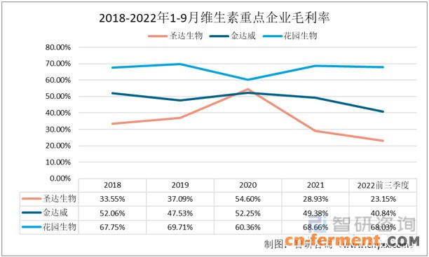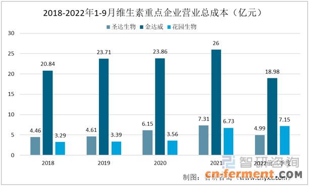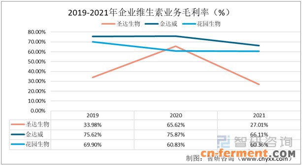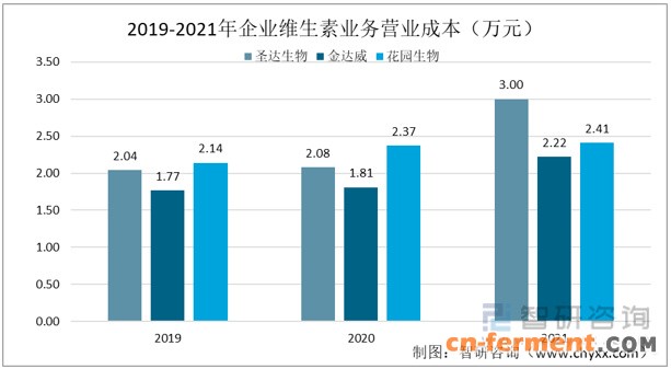 随着维生素业务规模的扩大,三家企业的维生素业务的营业成本都在逐年增加。2021年,圣达生物、金达威和花园生物的维生素业务营业成本分别为3亿元、2.22亿元和2.41亿元。