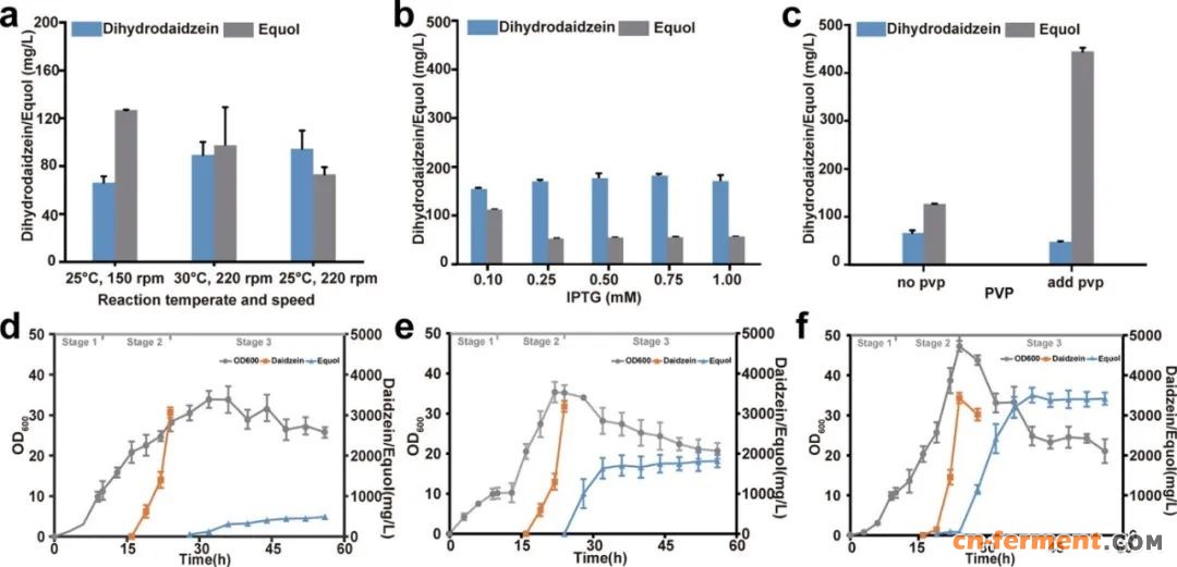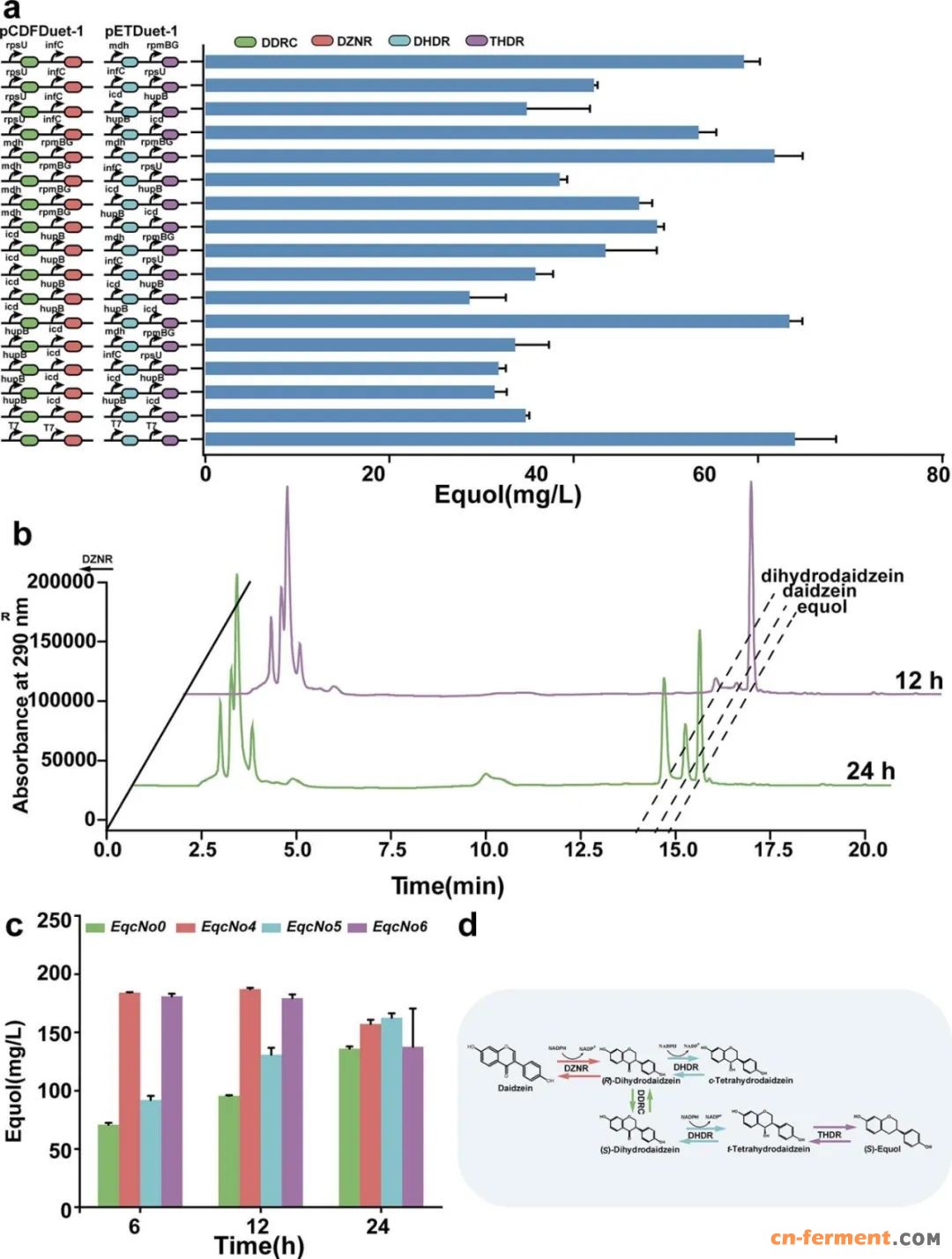 针对此问题,江南大学食品合成生物学与生物制造团队研究人员利用大肠杆菌构建了用于高效还原大豆苷元合成(S)-雌马酚的细胞工厂。首先,研究人员发现了了(S)-雌马酚合成途径的完全可逆性—即从大豆苷元到(S)-雌马酚的4步酶促反应均是可逆的,这在植物天然产物的转化中是较为罕见的。为此,研究人员建立了阻断(S)-雌马酚向大豆苷元逆向转化的策略。接下来,使用进化原理筛选并鉴定了高效的大豆苷元还原酶。研究者发现还原力NADPH在该路径中的重要角色。在分析了辅助因子代谢模型后,重新设计了一个新的NADPH池,使整个合成途径可以顺利进行。最后,在优化合成体系的代谢通量后,根据前期发现的该过程的氧敏感和搅拌敏感的特点,制定了发酵控制策略,使用5 L生物反应器可实现合成3418.5 mg/L (S)-雌马酚,转化率约为85.9%。本研究为生产(S)-雌马酚提供了一条可行的工艺路线。