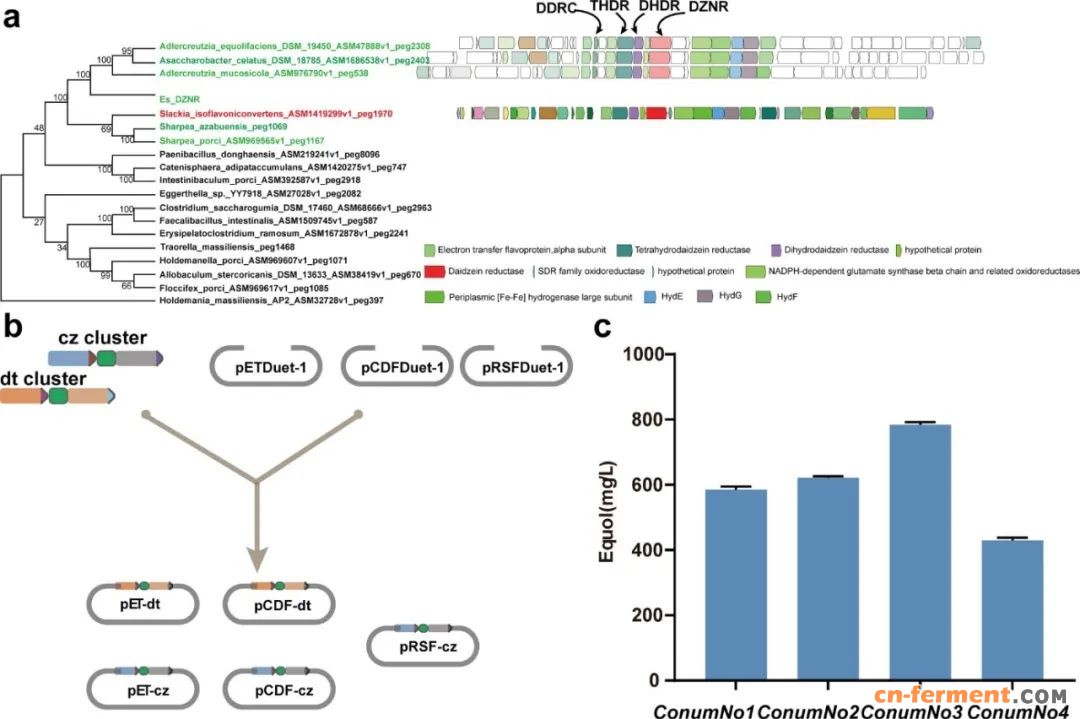 (S)-雌马酚(Equol)是一种具有雌激素活性的多功能异黄酮物质,由肠道细菌代谢大豆苷元而来,具有一定的个体特异性。医学研究表明,与其他异黄酮相比,(S)-雌马酚具有更高的生理活性。例如,它的抗氧化能力约为大豆苷元的1.5倍,在预防和治疗炎症相关疾病,如皮肤病、脱发、肥胖、潮热,以及一些与激素有关的疾病方面表现出积极的作用,被称为“功能性最强的异黄酮”。化学合成(S)-雌马酚的存在催化剂昂贵、手性拆分困难等问题;利用肠道细菌生产雌马酚存在发酵条件苛刻、生产率低下等问题。因此,构建耐氧微生物细胞工厂合成(S)-雌马酚不失为一种有吸引力的替代策略。