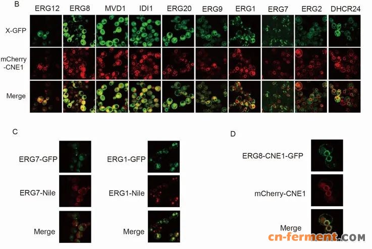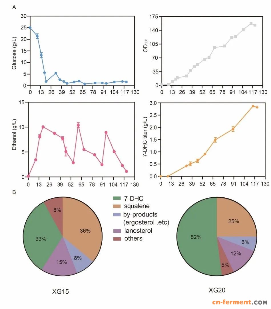 portant; overflow-wrap: break-word !important;">参与合成7-DHC的酶分布于不同的亚细胞结构中,这可能不利于中间代谢物的传递,进而影响7-DHC的合成。为了避免上述问题,该研究将角鲨烯和7-DHC模块中的6个基因(ERG7、ERG20、IDI1、MVD1、ERG8和ERG12)依次重定位于内质网中,通过内质网区室化进一步重构甾醇代谢路径。在此基础上,过表达INO2增加内质网表面积(图4),摇瓶发酵结果显示,7-DHC的产量显著增加,达到455.6 mg/L。在5 L发酵罐上,通过补料分批发酵,获得2870 mg/L的7-DHC,是迄今为止报道的最高产量(图5)。