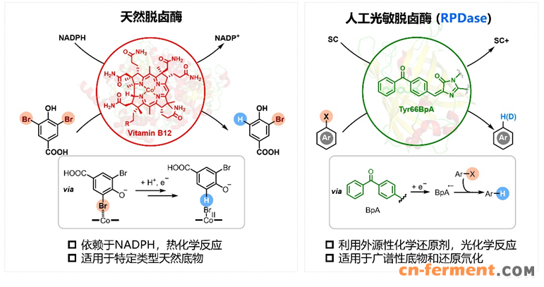 图1.天然还原性脱卤酶和人工光敏脱卤酶的对比