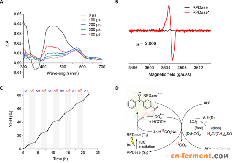 团队对该人工光生物催化体系的酶催化机制进行了深入探究(图3)。通过TEMPO自由基捕获、瞬态吸收光谱和电子顺磁共振等实验证明了芳基自由基的生成。同位素实验表明,甲酸钠是非常高效的终端还原剂和氢供体,氢化效率显著高于天然还原剂抗坏血酸钠。此外,开关灯控制实验发现,黑暗条件下反应会继续进行,表明反应过程中存在一定的链传递过程。基于上述实验结果,团队提出了可能的光生物催化机制。在RPDase空腔微环境中,光照和甲酸钠促使了强还原性二苯甲酮自由基阴离子和二氧化碳阴离子自由基的生成,两者均可促进芳基卤化物的单电子还原生成芳基自由基,并进一步捕获甲酸钠的氢原子或氘原子生成还原产物。