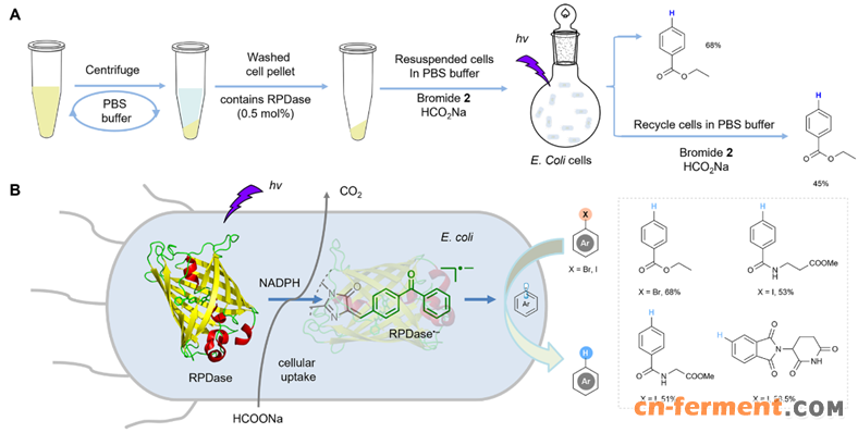 钟芳锐团队致力于绿色仿生和人工生物催化领域的研究,基于化学原理驱动酶催化选择性合成的理念,发展了含有非天然光敏活性基团的人工光敏金属酶(J. Am. Chem. Soc. 2021, 143, 617)和“三重态光酶”(Nature, 2022, 611, 715),扩展了多铜氧化酶的催化杂泛性实现了非天然吲哚类底物的立体选择性氧化交叉偶联反应(Angew. Chem. Int. Ed., 2023, e202219034)。在上述人工生物催化研究基础上,团队深入开展化学和生物催化的交叉研究,利用基因密码拓展技术重构开发了含化学光催化剂的人工光敏脱卤酶(RPDase),通过捕获光子能量来驱动广谱性芳香卤化物的脱卤氢/氘化。与金属辅因子依赖性的天然脱卤酶不同,RPDase通过完全非天然的光致电子转移催化机制进行,能利用外源性甲酸钠为终端还原剂,从而避免了天然脱卤酶对还原性辅酶NADPH的依赖(图1)。