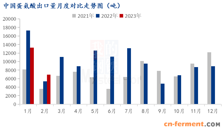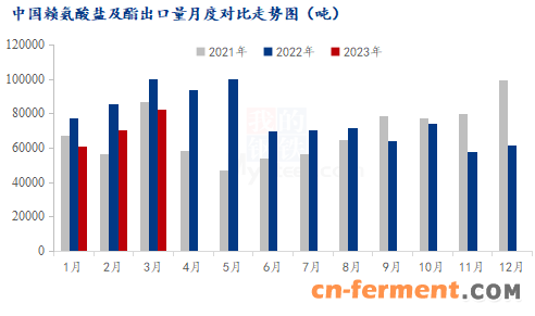 据中国海关数据统计,2023年3月中国赖氨酸与赖氨酸盐及酯的出口量约为82553.9吨,环比增幅17.22%,同比降幅17.56%。2023年1-3月我国赖氨酸与赖氨酸盐及酯的出口量约为214056.2吨,同比降幅18.62%。回顾一季度赖氨酸出口,一季度总量同比虽有下降,但主要原因是去年超买现象严重导致2022年一季度出口量较多。分月度来看呈现逐月增加一万吨左右形势,说明国外消费市场正在逐步回暖,国内供需博弈阶段迎来国外消费利好回暖,短期赖氨酸价格或受此提振,能否反弹关注国内企业报价及战略计划。