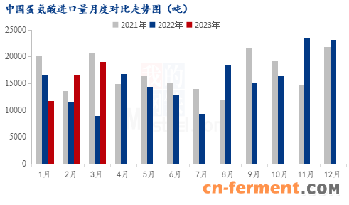 据中国海关数据统计,2023年3月,我国固体蛋氨酸进口量约为18971.7吨,环比增幅13.57%;同比增幅111.35%。2023年1-3月,我国固体蛋氨酸进口量约为47454吨, 同比增幅27.54%。