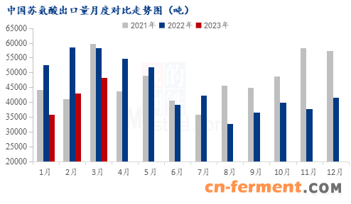 据中国海关数据统计,2023年3月中国苏氨酸出口量48359.2吨,环比增幅12.24%,同比降幅17%。2023年1-3月,我国苏氨酸出口量约为127287吨,同比降幅24.89%。回顾一季度苏氨酸出口,去年超买现象严重导致2022年一季度出口量较多,但一季度总量同比下滑24.89%,出口端未来几个季度压力较大,保持关注。分月度来看苏氨酸出口呈现逐月增加态势,3月份出口量终于回归月度出口平均水平,国外市场虽有恢复,但不及预期。国内苏氨酸价格能否继续反弹,关注企业生产及下游补库情况。