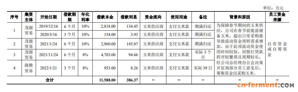 审核问询函指出,该公司通过汇洋生物、福洋淀粉、茂源贸易、隆腾贸易向员工集资,用以采购玉米。而根据历次员工集资采购明细情况,部分集资对象非福洋生物员工。同时,福洋生物玉米采购需求可预测,报告期 ( 2019-2021 年及 2022 年上半年 ) 各期末公司可用银行授信额度基本可以满足提前储备玉米的融资需求。