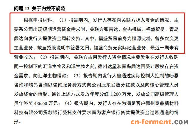 根据审核问询函信息,报告期内,福洋生物存在向关联方拆入资金的情况,主要系出现短期运营资金需求时,关联方张雷达、金杰机械、福盛商贸、青岛鼎达提供资金周转支持。值得注意的是,福盛商贸无实际经营业务,最近一期未有营业收入,却在 2020 年向福洋生物子公司汇洋生物共计拆出 1802.97 万元。
