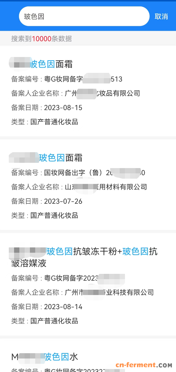 另一方面,随着玻色因的专利到期,国内品牌也开始广泛使用玻色因,如丸美、珀莱雅、百植萃等品牌均推出含有玻色因成分的产品。不少白牌的产品甚至还以“玻色因”命名,如今市场上宣称含玻色因的产品已是多如牛毛。青眼以“玻色因”为关键词,在化妆品监管APP上,搜索显示共有10000件以此命名的产品。