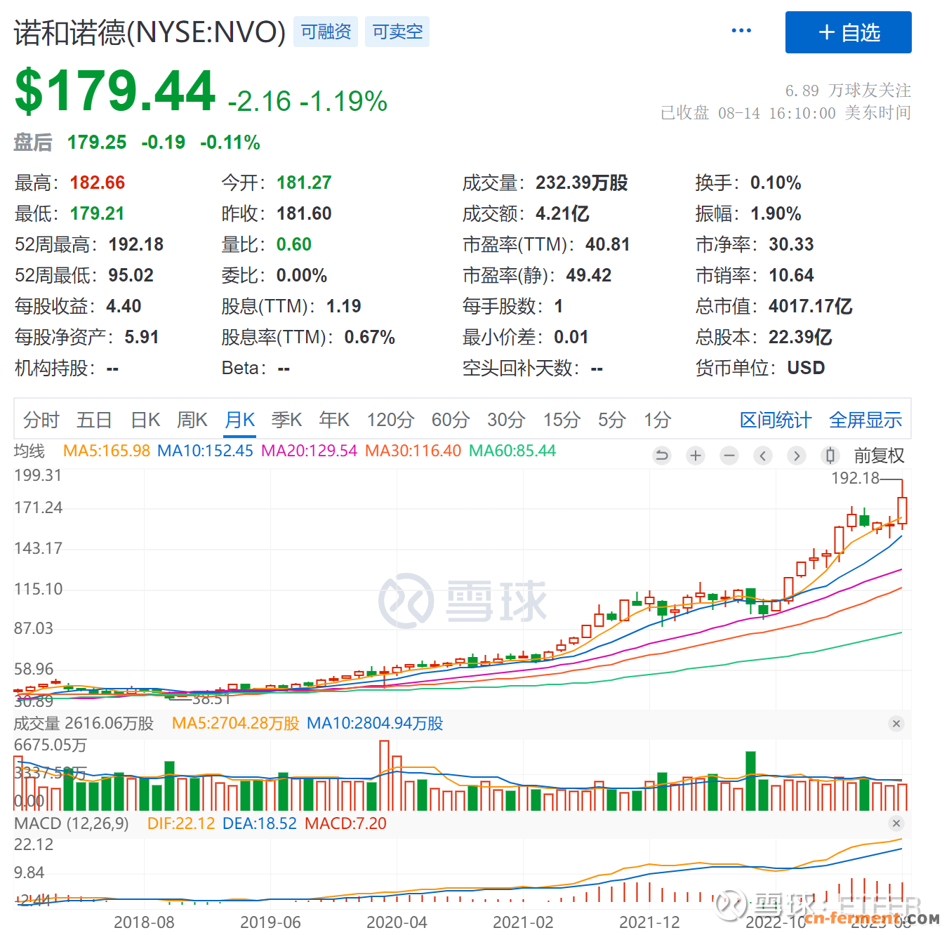 $诺和诺德(NVO)$ 是世界领先的生物制药公司,在用于糖尿病治疗的胰岛素开发和生产方面居世界领先地位。诺和诺德总部位于丹麦首都哥本哈根,员工总数30,000人,分布于70个国家,产品销售遍布179个国家。在欧美诺和诺德均建有生产厂。