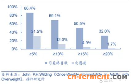 利拉鲁肽组较安慰剂组下降 5.4%,司美格鲁肽组下降 12.5%。利拉鲁肽组仅14.4%的受试者体重下降超过15%,司美格鲁肽组则高达50.5%的受试者体重下降超过15%,超过32%的受试者体重下降超过20%。