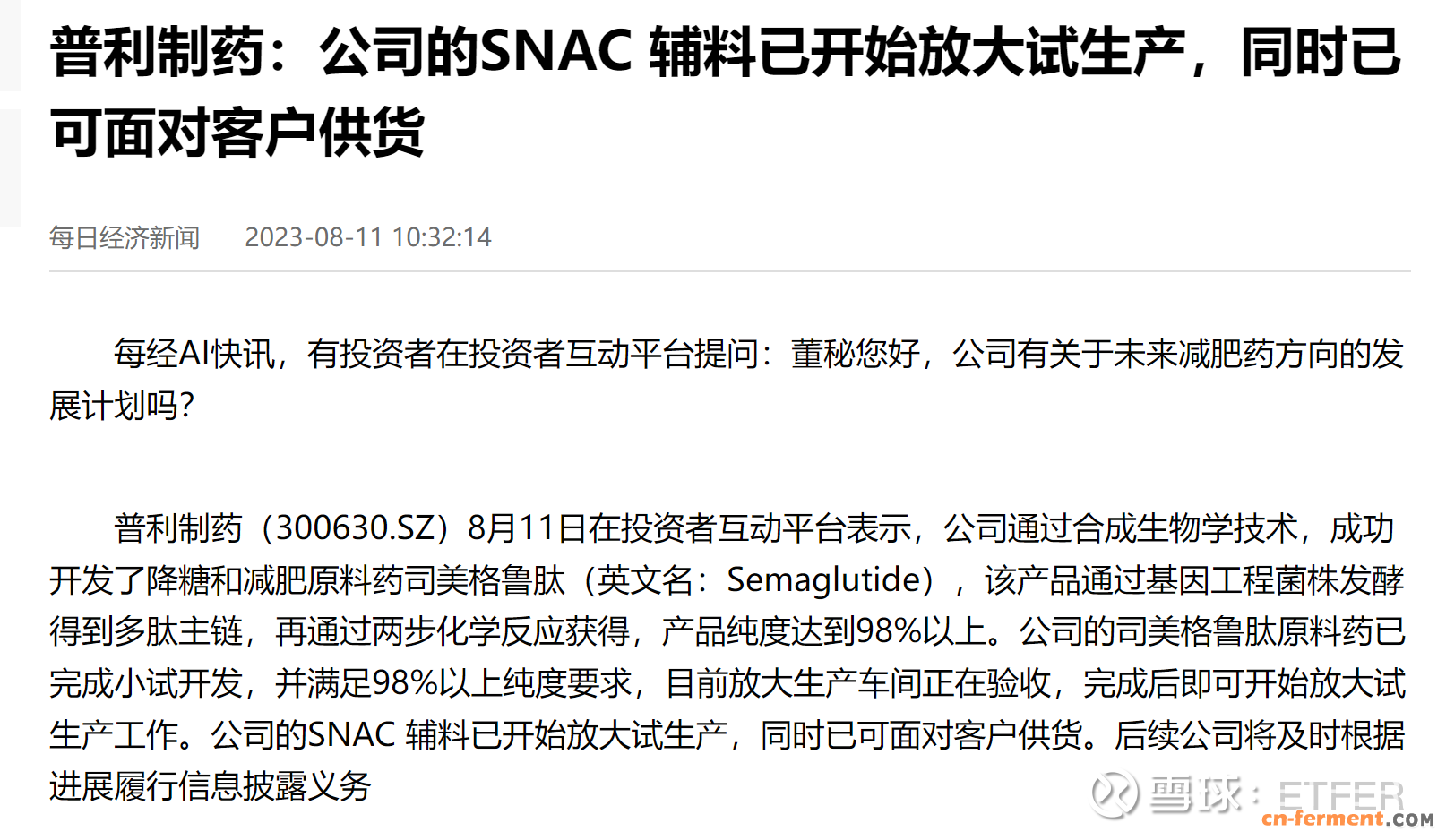 普利制药在8月11日在投资者互动平台表示,公司通过合成生物学技术,成功开发了降糖和减肥原料药司美格鲁肽(英文名:Semaglutide),该产品通过基因工程菌株发酵得到多肽主链,再通过两步化学反应获得,产品纯度达到98%以上。公司的司美格鲁肽原料药已完成小试开发,并满足98%以上纯度要求,目前放大生产车间正在验收,完成后即可开始放大试生产工作。公司的SNAC 辅料已开始放大试生产,同时已可面对客户供货。