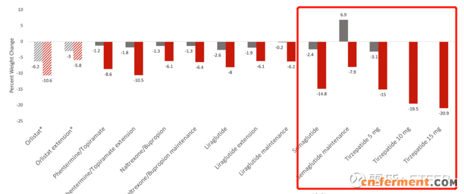 临床数据表明,与现有已批准药物相比,替尔泊肽表现出更优异的治疗效果,与安慰剂相比,不同剂量的体重减轻超过 15%(15-20.9% vs. 3.1%)。