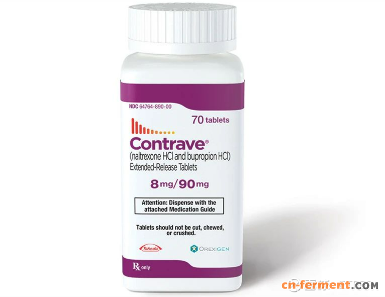 3、纳曲酮缓释/丁螺酮缓释。纳曲酮缓释(Naltrexone SR)/丁螺酮缓释(bupropion SR)是Orexigen Pharmaceuticals开发的组合药物,并于2014年获得FDA批准用于减肥。纳曲酮和安非他酮作用于神经递质,例如中枢神经系统中的多巴胺和去甲肾上腺素,降低食欲和食物摄入量。