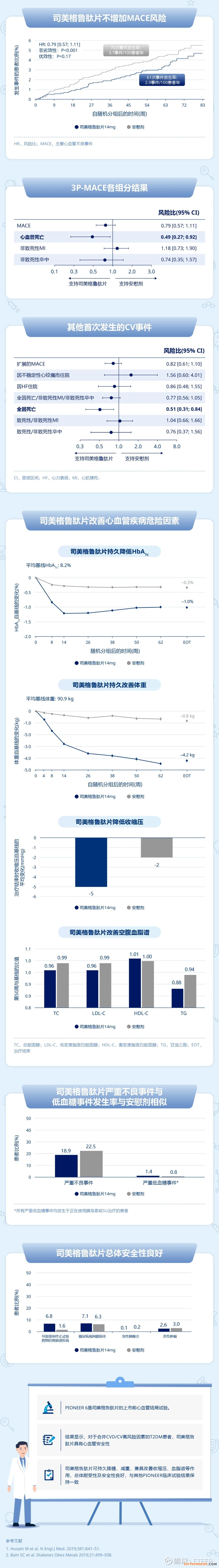 药效方面,司美格鲁肽相比于安慰剂能获得良好的体重减轻效果 (14.8% vs 2.4%),司美格鲁肽的潜在副作用与利拉鲁肽相似。