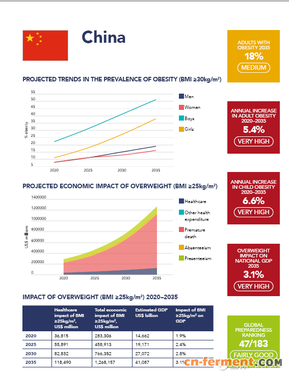 2020年全球肥胖/超重(BMI≥25)的人数为26亿人,预计到2035年,肥胖/超重患病率从2020年的38%升至51%,全球超过40亿人属于肥胖/超重。预计儿童和青少年肥胖患病率的上升幅度最大。男孩肥胖患病率从2020年的10%升至2035年的20%,女孩肥胖患病率从8%升至18%。