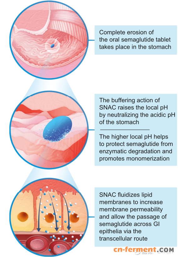 当片剂在胃中溶解时,SNAC 缓冲局部 pH 值,减少胃蛋白酶对司美格鲁肽的降解。SNAC 还通过改变溶液极性、削弱导致司美格鲁肽寡聚化的疏水相互作用来促进司美格鲁肽单体化。SNAC 的间接作用涉及其掺入胃细胞脂膜,使司美格鲁肽能够暂时且可逆地跨细胞通过。