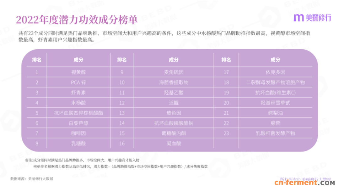 由于特殊的抗氧化能力,麦角硫因已经成为护肤界的高潜抗衰成分。美丽修行《2022年度潜力功效成分榜单》,麦角硫因位列潜力功效成分第九名,此外美修大数据统计各大抗衰成分在抗衰护肤品中的备案增速,麦角硫因以64.2%的增速位列第八名。