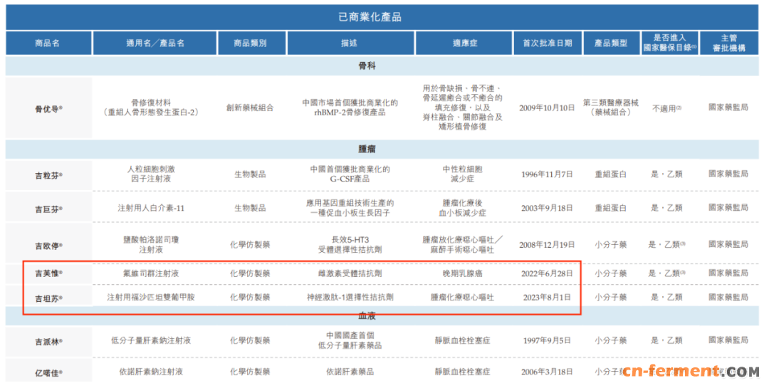 经历30余年的发展,九源基因已经上市了8款产品,包括骨修复材料骨优导,五款肿瘤药品吉粒芬、吉巨芬、吉欧停、吉芙惟与吉坦苏,以及两款用于静脉血栓栓塞症的血液药品亿喏佳、吉派林。