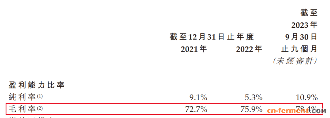 2021年-2023年9月,九源基因的毛利率分别为72.7%、75.9%、78.4%。公司虽未披露骨优导的具体毛利率数据,但数次提及,过往毛利率的增加主要是由于毛利率相对较高的骨优导销售收益比例增加。