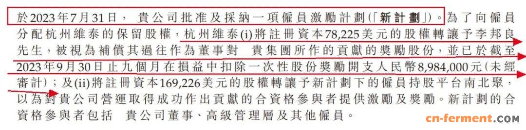 在IPO前半年,九源基因批准了一项新的激励计划。紧接着,在2023年8月,公司股权激励平台杭州维泰将注册资本7.82万美元的股权转让予李邦良,以表扬其对集团的增长和发展所作的贡献,而这对应的股份奖励开支高达898.4万元。