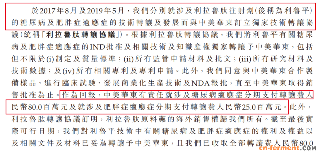 2017年8月及2019年5月,九源基因将利拉鲁肽(后称为利鲁平)的糖尿病、肥胖症适应症技术转让予中美华东,转让费合计1.05亿元。而这款利拉鲁肽是中国首款获得IND批准的利拉鲁肽在研生物类似药,其重要性可见一斑。