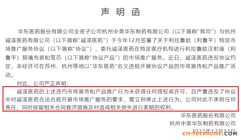 两天后,就利拉鲁肽推广问题,华东医药官微发布声明称,诚泽医药违反协议约定,未经许可在苏州、杭州等地以“华东医药”名义违规开展协议产品的市场宣传和产品推广活动,要求其立刻停止上述行为,同时保留相关合同救济措施及对造成相关损失进行索赔的权利。