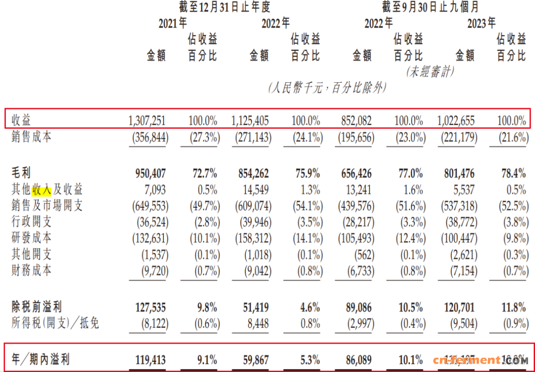 招股书显示,2021年-2023年9月,九源基因实现收益13.07亿元、11.25亿元和10.23亿元;溢利1.19亿元、5986.7万元及1.11亿元。