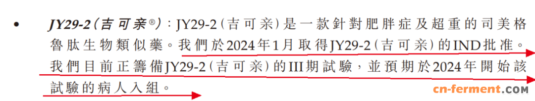 于2024年1月,吉可亲用于治疗肥胖症及超重取得国家药监局的IND批准,目前正筹备吉可亲的III期试验,并预期于2024年开始该试验的病人入组。