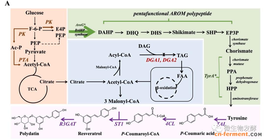 近日,华东理工大学的研究人员发表了题为“metabolic engineering for the high-yield production of polydatin in Yarrowia lipolytica”的研究论文,以解脂耶氏酵母为底盘菌株,葡萄糖为碳源,通过增加前体供应、改变碳代谢、消除产品降解途径以及优化培养基中的葡萄糖浓度的组合策略,实现虎杖苷高产,产率达6.88g/L。