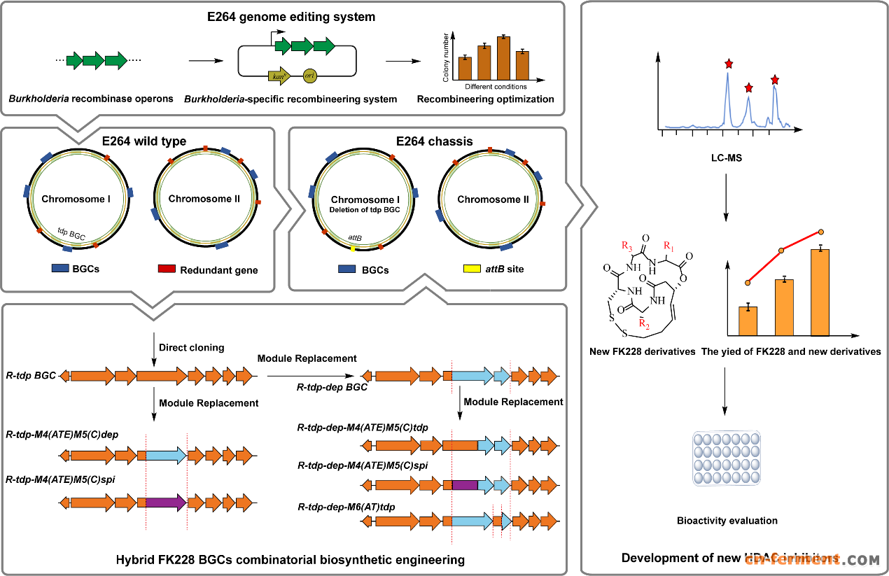 FK228(Romidepsin,罗米地辛)是一类由编码I型聚酮合酶(PKS)和非核糖体多肽合成酶(NRPS)杂合基因簇催化合成的一种特殊的双环缩酚酸肽类化合物。因其结构上含有一个独特的二硫键功能基团,该功能团在FK228进入细胞内被还原形成硫醇,与组蛋白去乙酰化酶(HDACs)催化域中心的二价锌离子(Zn2+)发生螯合反应,从而抑制HDACs的活性。然而,鉴于FK228的生产菌株产量低(19 mg/L)、化学合成复杂且收率低以及该类化合物的心脏毒性等缺点,开发有效的合成生物学平台以高产和改造该类药物已经成为研究重点。