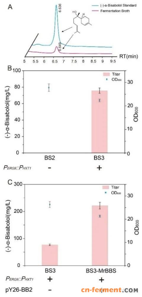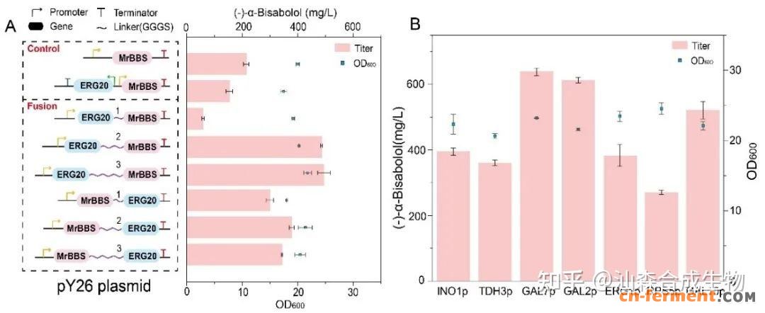 图3.关键基因融合表达和启动子强度对(–)-α-红没药醇产量的影响
