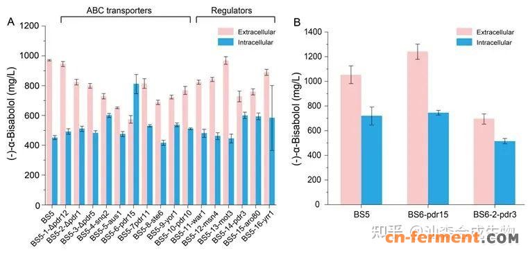 图5.可能参与转运相关基因的调控对胞内外(–)-α-红没药醇含量的影响