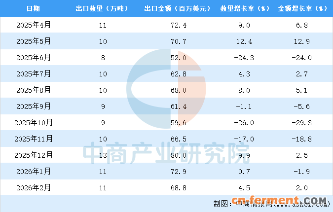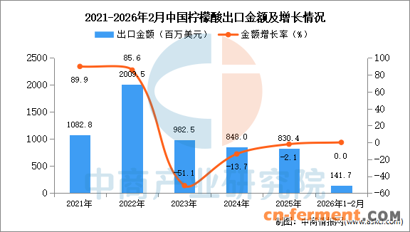 2026年2月中国柠檬酸出口量及金额增长情况