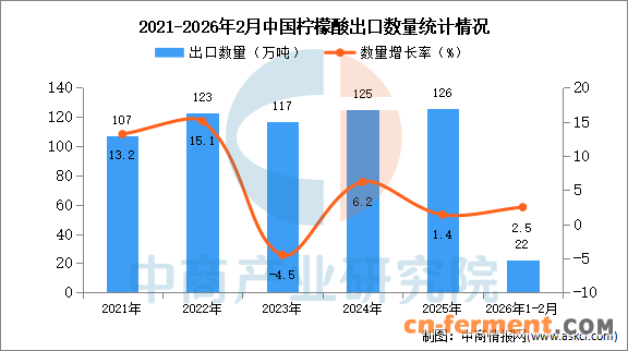 2026年1-2月中国柠檬酸出口数据统计分析:出口量同比增长2.5%