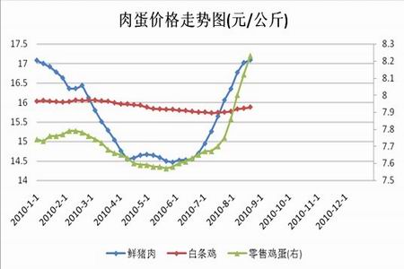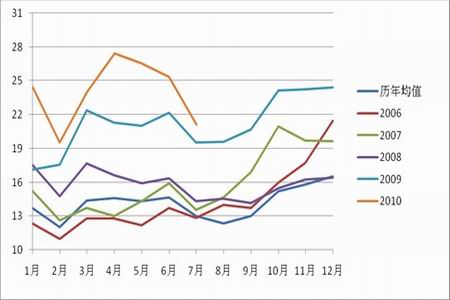 另外,从图7、8也可以看出,6月以来,中国畜产品价格持续上扬,其中猪肉和鸡蛋的表现尤为突出,鸡肉价格则是碎步上扬,受价格回升影响,养殖业利润明显好转,猪粮比已经回到6以上,鸡、蛋料比亦稳步扬,要好于09年的水准。预计2010年下半年,鸡蛋的产量将会高于上半年,且增速亦会增加;鸡肉的产量亦会稳步增加,增速略与上半年持平;猪肉产量也会稳步增加,由于去年下半年猪存栏较大,使得今年上半年猪肉产量较大,考虑到目前中国的生猪存栏同样突出,预计下半年猪肉产量会继续增长,但增速要小于上半年。整体上,全年养殖业将会稳步增加,保守估计猪肉产量会达到5000万吨,鸡肉1400万吨,禽蛋2750万吨,对玉米的需求可能同比会增加272万吨左右。