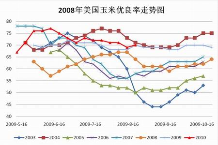 2010年6月以来美国玉米作物生长优良率一直保持良好的状况,截止目前仍然保持在70的高位,仅次于2004年的水准,与2009年极为接近,由于前期生长情况要明显好于去年同期,如果后期不出现天气问题,单产应该要高于去年,美国农业部的8月报告预估,09年玉米单153.75蒲/英亩,2010年则为154.05蒲/英亩,与09年接近。目前有市场人士认为,9月美国农业部将下调玉米单产,理由在于玉米考察队的调查结果显示美国玉米边缘产区单产不理想,不过笔者更加相信美国玉米的平均单产仍然要取决于主产区的单产状况,而且按照目前的单产预估,小幅的下调就会低于09年水平,显然与美国农业部的作物优良率、结荚率等调查报告相悖甚远,因此笔者仍然相信:后期如果没有天气灾害,2010年美国玉米的单产很可能会高于目前的154的水平,而不会下降。