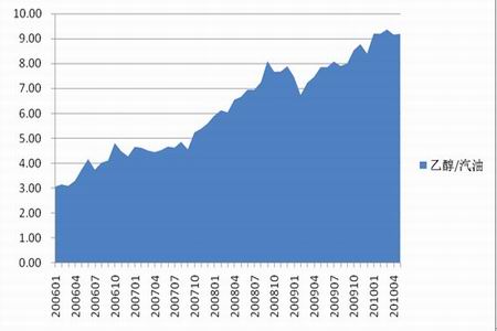 根据美国能源情报署报告,2009年美国生产燃料乙醇107.58亿加仑,累计消费108.47亿加仑,而汽油的消费量为1379亿加仑,实际掺混比例为7.87%;截止2010年5月美国燃料乙醇生产量53亿加仑,同比增长29.44%,需求量51.8亿加仑,同比增长24.74%,汽油消费量562亿加仑,同比减少-0.41%,实际掺混比例9.22%,可见今年燃料乙醇的需求增长主要来自掺混比例的提高。另外,根据周度数据来看,自6月1日至8月22日当周,汽油消费量稳步增长,已经超过去前同期水平;同期燃料乙醇生产周均3541.2万加仑,略低于前五月水平,掺混比例均值亦下降至9.01,并未随着汽油消费量增加保持稳定,那么按照目前的数据,如果今年汽油消费与去年持平,而掺混比例提高至9.1预估均值水平,将需要燃料乙醇125.5亿加仑,增幅16.6%,与去年增幅持平; 2011年的乙醇产量难以估算,2010年美国燃料乙醇产能130亿加仑,在建产能14.32亿加仑,将合计达到144.6亿加仑,另外,保守估计2011年汽油消费仍然是1379亿加仑,掺混比例同步增长0.5,达到9.6(目前是10%的掺混政策),将会有132.4亿加仑的需求。由此,对玉米的需求估计: 09至2011年,生产燃料乙醇需求玉米的数量分别为10570、12331和13008万吨,09和10年的增量预估分别为1760.8万吨和677.5万吨,两年合计2438.3万吨;8月美国农业部报告显示,09/10和10/11年度玉米FSI用量分别为14898和15469万吨,增幅分别为2215和572万吨,合计2787万吨。对比来看,从两年合计来看,美国农业部数据09/10年度的数据可能比较合理;但是结构上可能出入,09/10年度的可能存在高估, 10/11年度的数据则可能被低估,因笔者对2010年的燃料乙醇算法较为保守。