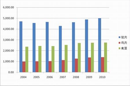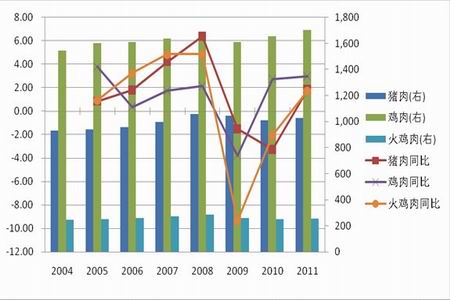 根据美国农业部8月27日公布的数据显示,美国2010、2011年的猪肉产量分别为1008和1027万吨,同比分别为-3.28%和1.28%,仍然处于恢复阶段;鸡肉产量分别为1655和1704万吨,同比分别为2.76%和2.97%,恢复迅速,而且预计2011年创出历史新高;火鸡肉分别为252和256万吨,同比分别为-2.03%和1.75%,也处于恢复阶段;三种肉类合计同比分别为0.17%和2.49%,美国养殖业确实处于恢复过程之中。