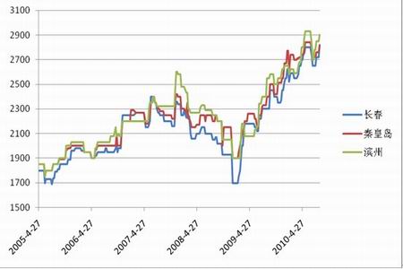 截止目前,市场对2010年存在着强烈的丰产预期,虽然东北地区播种受到延误,不过之前的温度回升迅速,玉米长势良好,降雨量过多致使部分低洼地被淹,绝产,不过东北仍以坡地为主,且历来存在降雨不足的问题,今年的情况可能是以坡地的高产来弥补低洼地的损失,单产可能达到正常水准,图2中的单产预估可能与事实相差无几;7月华北、黄淮地区光温水热条件较好,不过河南省受暴雨影响相对较大,可能单产受到一定影响,整体上可能仍然可以达到正常水准;西南、江南地带降雨量过多可能对玉米产量形成一定不利影响,不过这一部分地区产量较小,对全国的整体影响并不大,粗略估算,如果后期没有早霜问题,今年国内玉米的产量将在1.6亿吨以上。