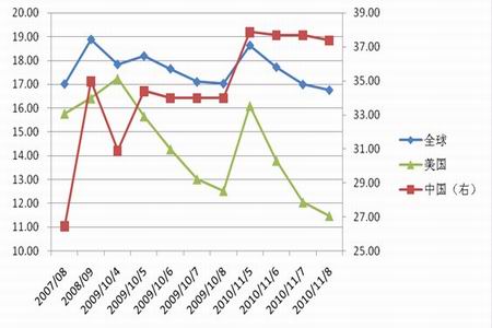 从美国农业部的报告来看(见表1),全球玉米产量的变化并不明显,对市场造成明显影响的显然是需求的急剧调整,世界玉米的库存消费比明显下降,尤其是美国库存消费比下降的非常迅速,从图12可以看出,09/10年度美国玉米的库存消费从5月开始急剧调低,主要表现对FSI用量的大幅调整上,之后7月份则是将饲料用量大幅调高,最终使美国09/10年度的库存消费比从4月份的17.24调降至12.52的低位水准;10/11年度的调整则是从6月开始,一方面是上一年度的期初库存调低546万吨,另一方面FSI用量调高279万吨,之后两个月亦是同样的思路,库存消费比从5月的16.09下调至8月的11.46。尽管笔者亦认为美国玉米的需求在迅速增长,但是饲料需求可能被高估,约500万吨左右;FSI用量总体估计比较合理,但是结构上存在调整的需要,09/10年度可能被高低,约200万吨,而10/11年度可能被低估,低估的幅度难于测算,这一点可能还需要更多的汽油消费数据,这又与美国经济的恢复程度息息相关,按美国燃料乙醇产能的极限水平来看,2011年玉米最高可消耗14207.5亿吨,比较笔者目前的估计量多1200万吨。