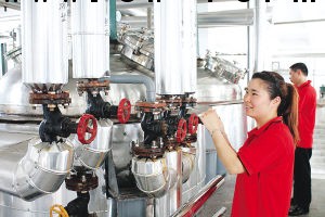 1日,建阳福建和泉生物科技有限公司生产车间内,工人正忙着生产酶酚酸原料药。和泉生物制药是2008年“9·8”签约落地的高科技项目,2009年6月正式投入生产酶酚酸和西索米星两种原料药,产品主要销往国内各大城市,今年1-7月产值已达2800万元。(刘禄兴 摄)