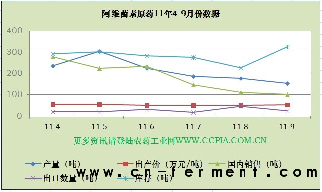 阿维菌素原药九月份产量继续小幅度下降,环比下降13.63%。产量在五月份最高,之后进入生产淡季,产量持续下滑。